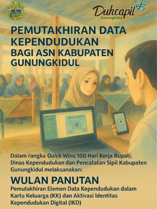 • Peluncuran ProgramWulan Panutan ini merupakan langkah awal dalam pelaksanaan dukungan 100 hari Kinerja Bupati berdasarkan Surat Edaran Bupati Gunungkidul NOMOR 27 TAHUN 2025, yang mengarahkan pembaruan data kependudukan bagi seluruh ASN, Pegawai BUMD, Tenaga Harian Lepas (THL), serta Pamong Kalurahan di Kabupaten Gunungkidul. Program ini berlangsung mulai dari 14 April 2025 hingga 15 Mei 2025 dan diharapkan dapat memberikan contoh nyata bagi masyarakat dalam pentingnya pembaruan data kependudukan. Dengan pembaruan data yang valid dan akurat, Kabupaten Gunungkidul berharap dapat meningkatkan Indeks Pembangunan Manusia (IPM) dan menciptakan administrasi kependudukan yang lebih tertib. Dengan data kependudukan yang akurat, pemerintah dapat menentukan target dan kebijakan yang terarah untuk memajukan masyarakat Gunungkidul Khususnya dan Indonesia pada