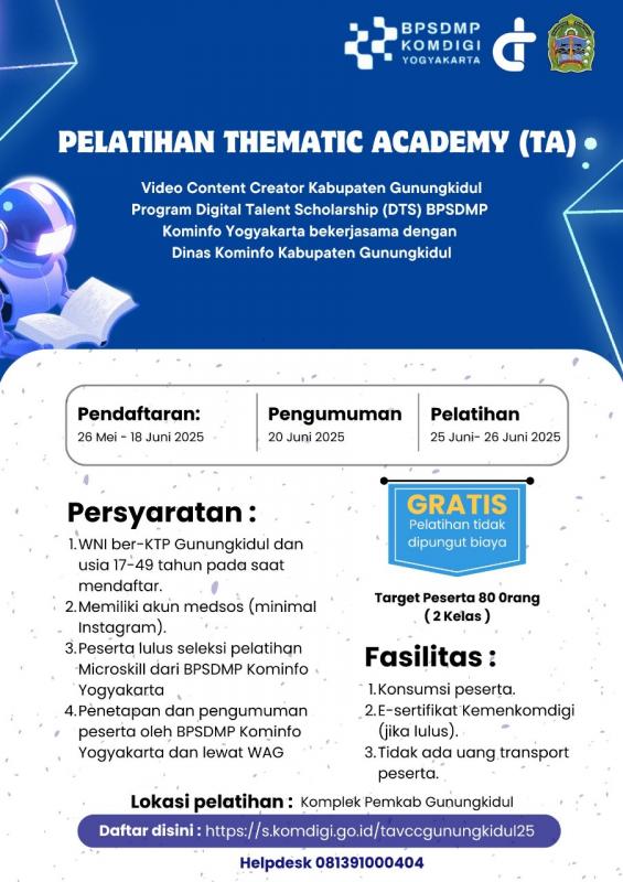 - Pendaftaran: 26 Mei – 18 Juni 2025 melalui tautan https://s.komdigi.go.id/tavccgunungkidul25